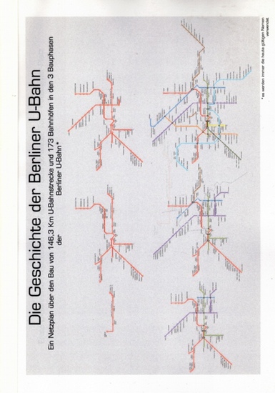 Die Geschichte der Berliner U-Bahn. Ein Netzplan über den Bau von 146,3 Km U-Bahnstrecke und 173 Bahnhöfen in den 3 Bauphasen der Perliner U-Bahn. [= Arbeitsgemeinschaft Berliner U-Bahn Ausgabe 1].